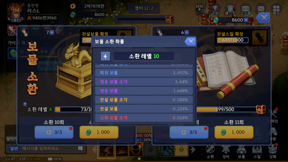 소환 레벨에 따라 높은 등급의 보물과 스킬을 소환할 수 있는 확률이 늘어납니다.